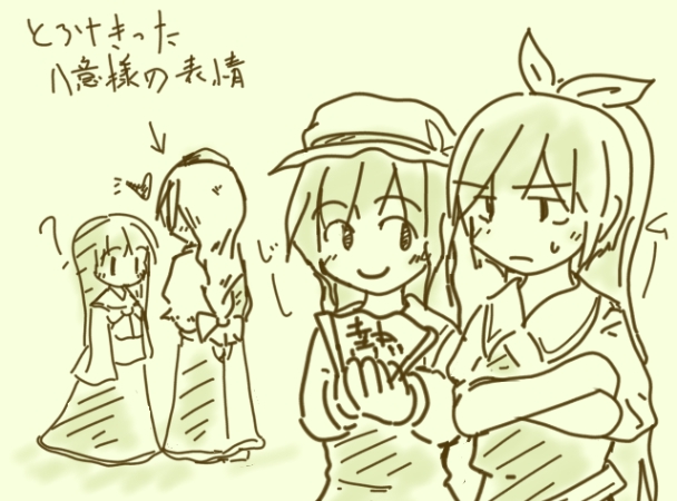 (図:丸くなった永琳をみて複雑な心境の依姫と、そんな妹を観察する豊姫)